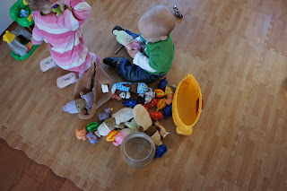 Amelia has figured out the concept of empty. She knows when her cup is empty (and can say the word quite well). She dumps all the snap beads out of her bucket and declares it "eh-tee". She drains her sippy cup and hands it to me saying "eh-tee" to ask for more. She even tosses a toy in an empty box and then shakes her head "no" as to say, "it's not empty anymore".