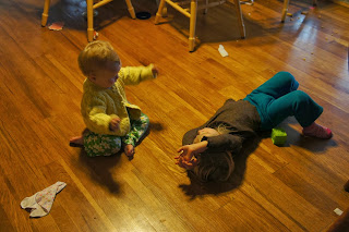 Erica is also starting to communicate much more. She has made the distinction between mama and dada and doesn't call Amelia either, although she doesn't have a name for her sister yet. She started saying something that sounds like "moo" when asked what a cow says. It's more of a raspberry ending in "oooo" but she does it consistently! She signs 'all done' and 'more' and has a mystery sign that looks something like "please" (patting her chest with her hand) when she wants something. She goes up to a door and does this sign or over to the fridge. Not exactly sure what she wants, but it's something!